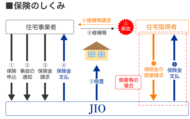 この保険は保険期間中に「住宅事業者の瑕疵担保責任の対象となる瑕疵に起因する事故」※注1が発生した場合、住宅事業者が補修等にかかった費用をJIOが住宅事業者にお支払いするものです。万が一、住宅事業者の倒産等により相当の期間を経過してもなお、修補等の瑕疵担保責任が実行されない場合は、住宅取得者がJIOへ直接保険金の請求をすることができます。