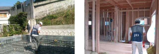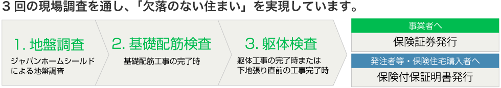 保険をご利用いただくにあたって、建物の検査が必要になります。地盤調査と建築士の資格をもった現場調査員による2回の現場検査を行います。合格しないと次へ進めない仕組みになっています。