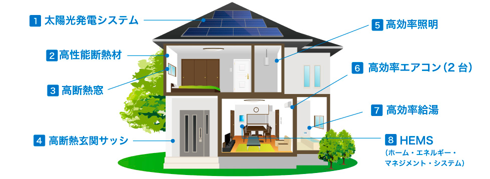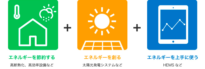 ZEHは、住まいの高断熱化や、高性能エアコン・LED、給湯設備の導入などの「省エネ」太陽光発電などでエネルギーを創る「創エネ」家庭のエネルギーの状態を見ることができる「HEMS(ホーム・エネルギー・マネジメント・システム)」を組み合わせた、「快適で高性能な住宅」です。