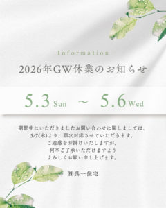 トップページ お知らせ 2026年 GW休業のお知らせ 2026年 GW休業のお知らせ 平素は格別のお引き立てを賜り、誠にありがとうございます。 2026年5月3日(日)~2026年5月6日(水)までの期間は休業とさせて頂きます。 期間中にいただきましたお問い合わせに関しましては、 2026年5月7日(木)より、順次対応させていただきます。 ご迷惑をお掛けいたしますが、何卒ご了承いただけますようよろしくお願い申し上げます。