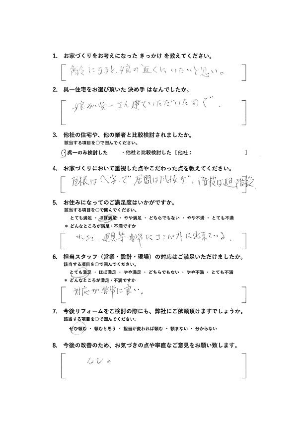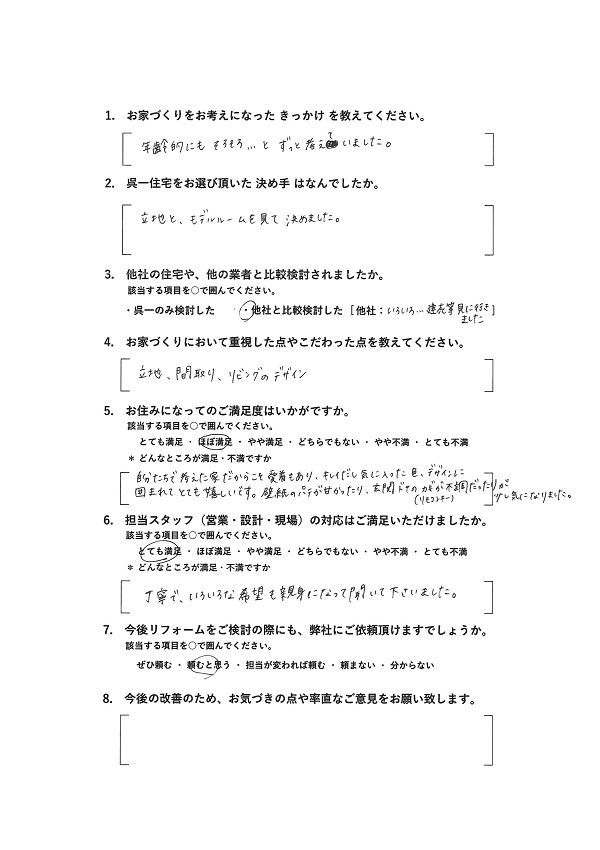 呉一住宅からのコメントE様アンケートご回答ありがとうございました。
