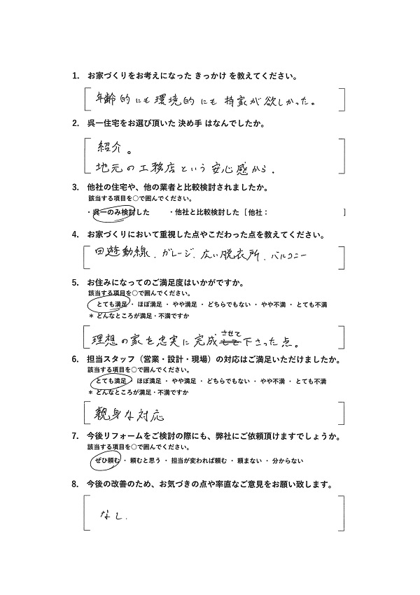 呉一住宅では、お客様の満足度向上と一層の改良改善のため引渡の1ヶ月後にアンケートを実施しています。